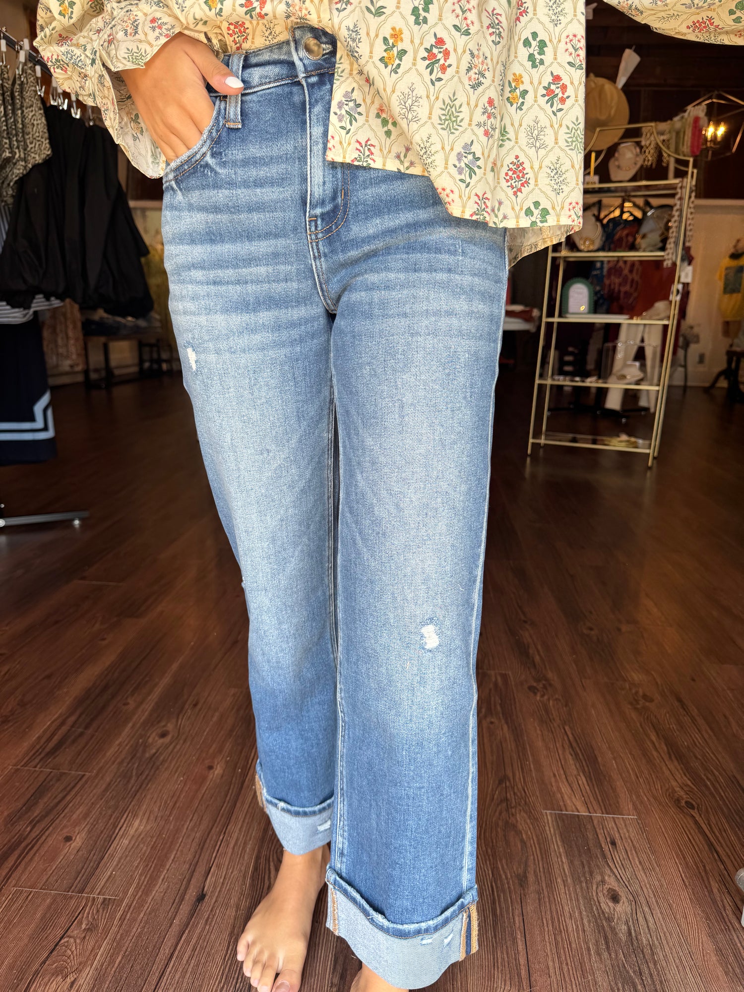 HIGH RISE TROUSER HEM PIN TUCK ANKLE WIDE JEANS
