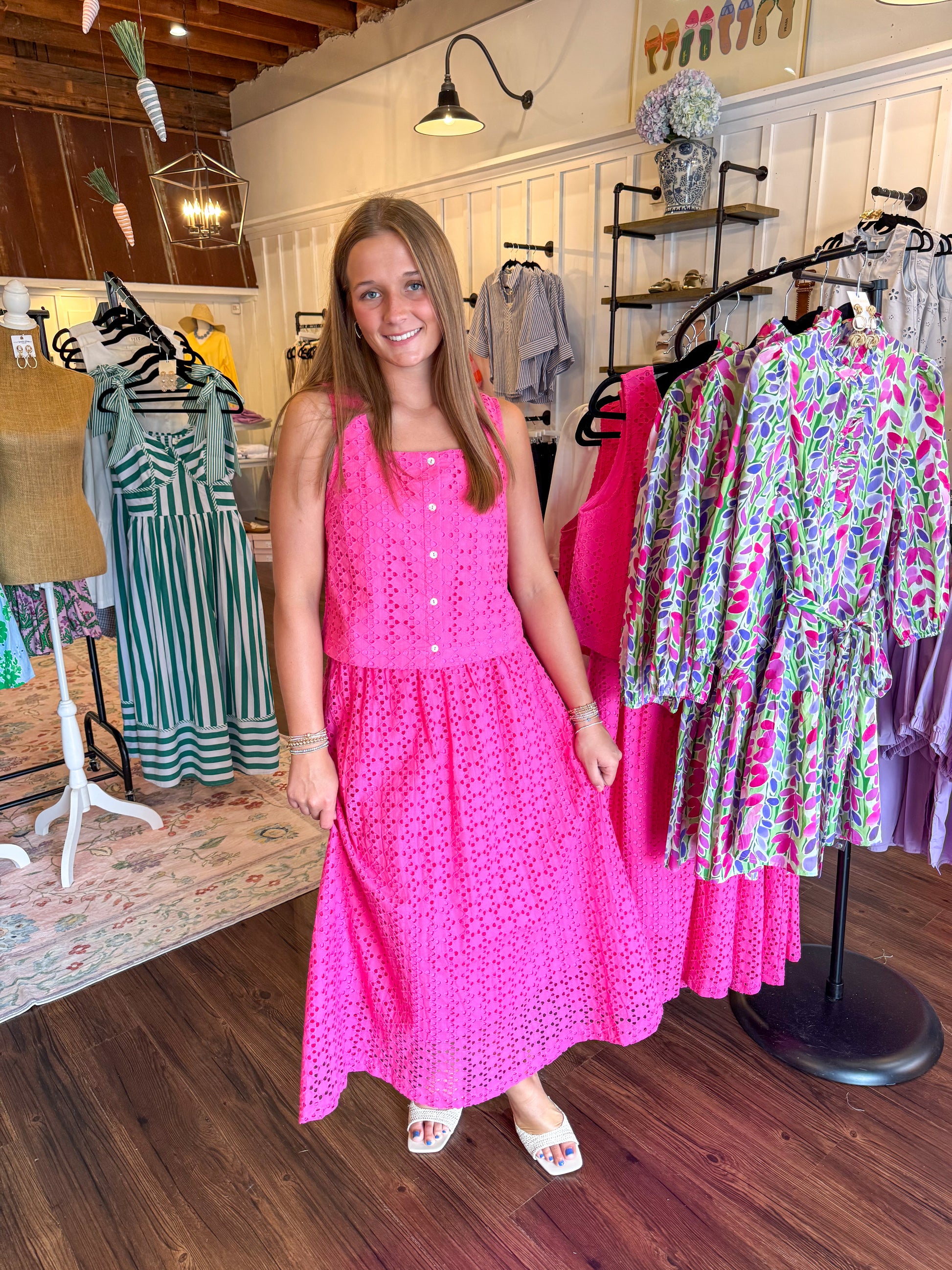 The Barbie Eyelet Set features a hot pink midi skirt complemented by a matching tank top, both crafted from breathable eyelet fabric. This ensemble offers a stylish and comfortable option for various occasions, with a focus on durability and ease of wear. The use of eyelet enhances ventilation, making it suitable for warm weather.
