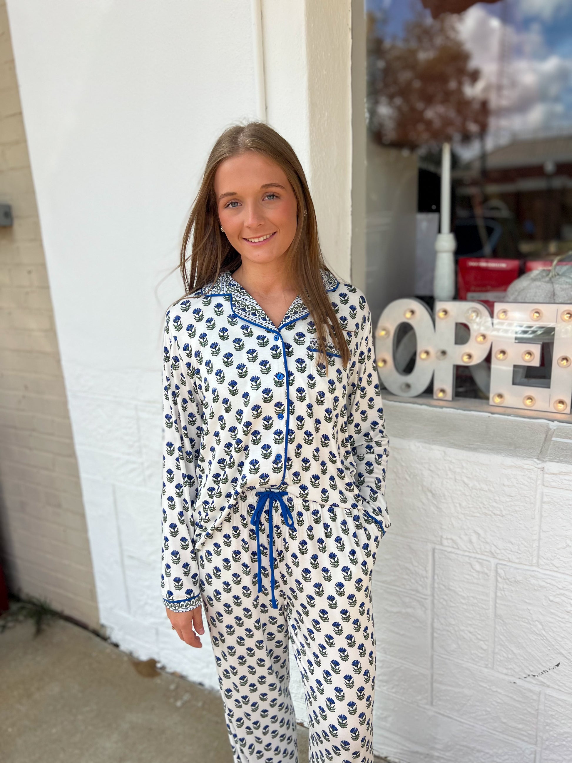 Expertly crafted with a durable lixblend fabric, the Charlotte Floral Flounder Pant Set is a luxurious combination of comfort and style. The long sleeve top and drawstring pants feature a beautiful block print in shades of blue and green on a cream background, making it a must-have addition to any sleepwear collection.