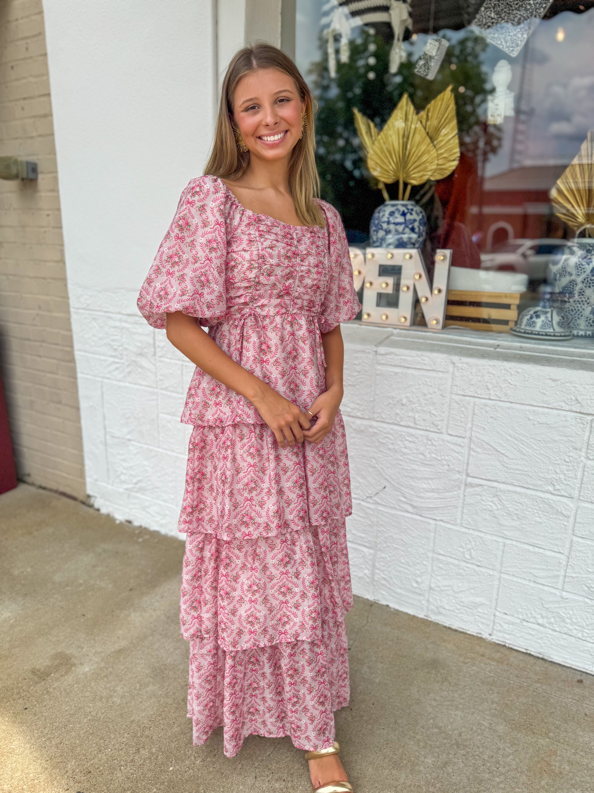 Experience the effortless elegance and grace of our Chiffon Maxi Dress. Featuring a tiered design, puff sleeves, and delicate bow and floral patterns, this dress is perfect for any occasion. With charming bow accents adding a touch of feminine flair, this dress is sure to make you feel confident and beautiful.