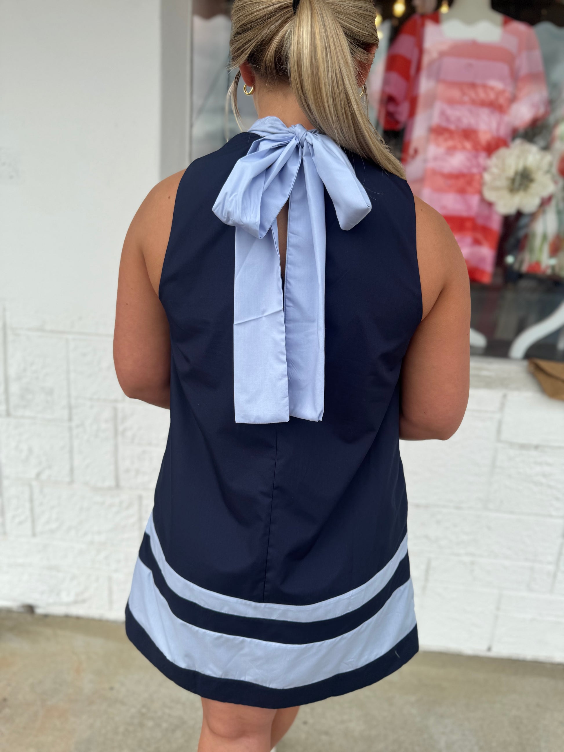 Introducing a navy and Columbia dress featuring a tie-around neck design. This midi-length garment is complemented by short sleeves, providing a balanced look suitable for various occasions. The combination of colors and style offers versatility, making it an ideal choice for both casual and semi-formal settings.