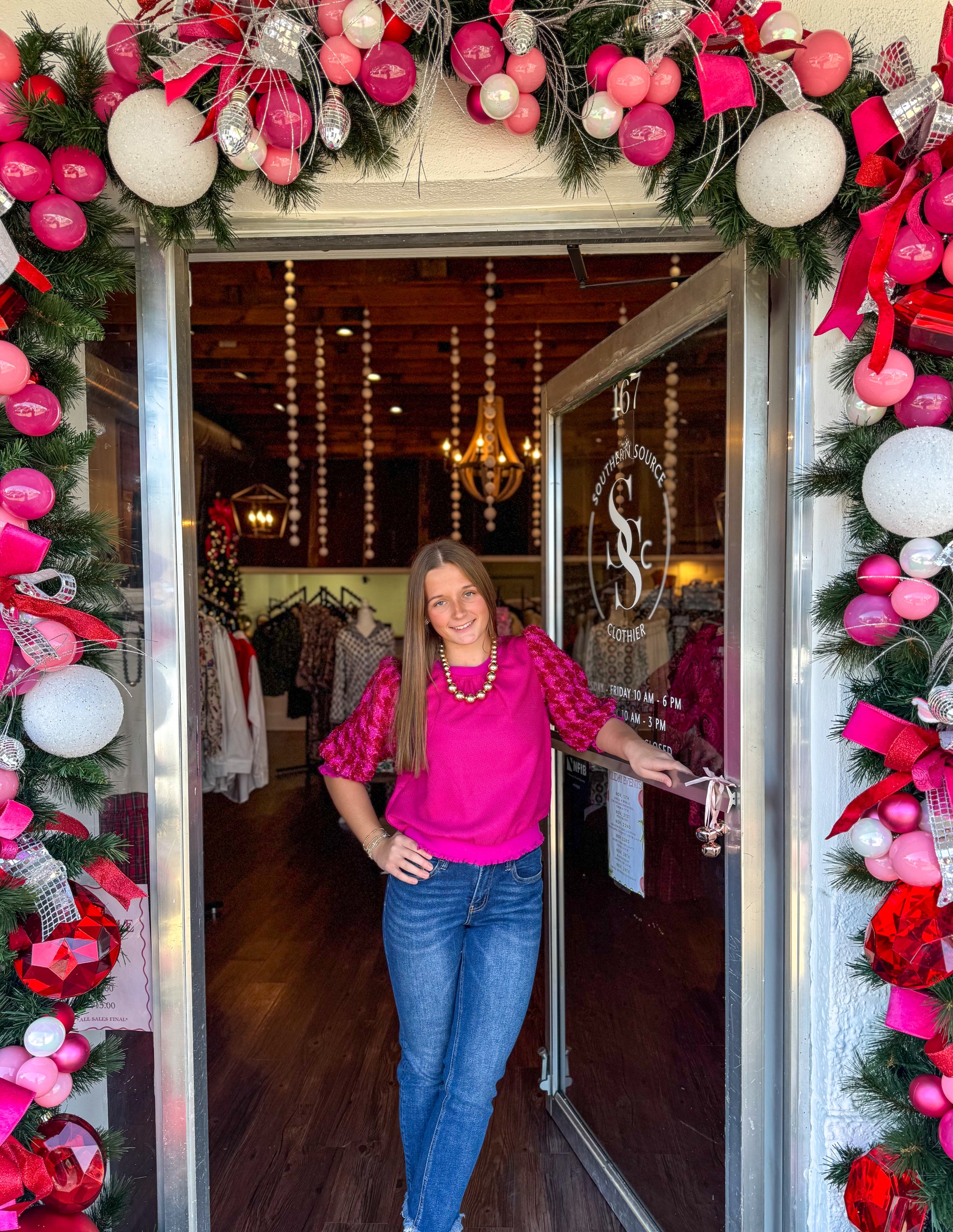 "Add a pop of color to your wardrobe with our Fuchsia Houndstooth Top! This playful top features a unique houndstooth texture and half puff sleeves. Perfect for a fun and quirky look. (No serious business allowed!)"