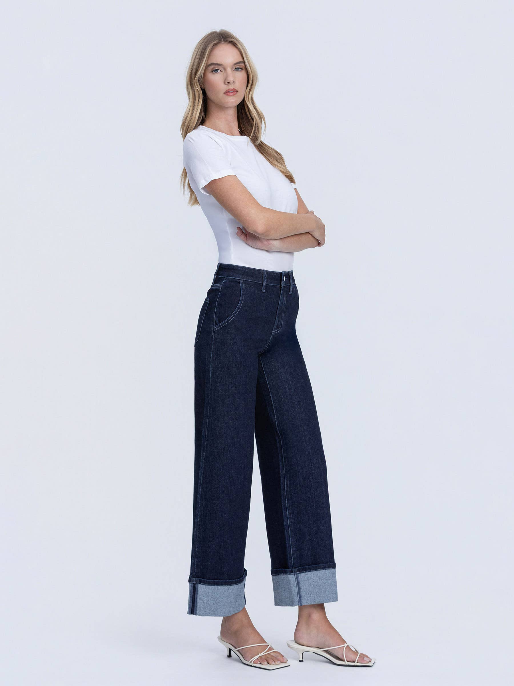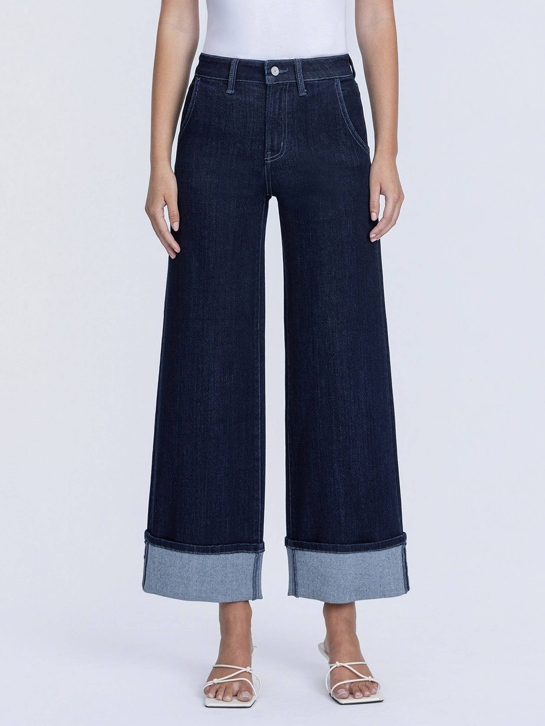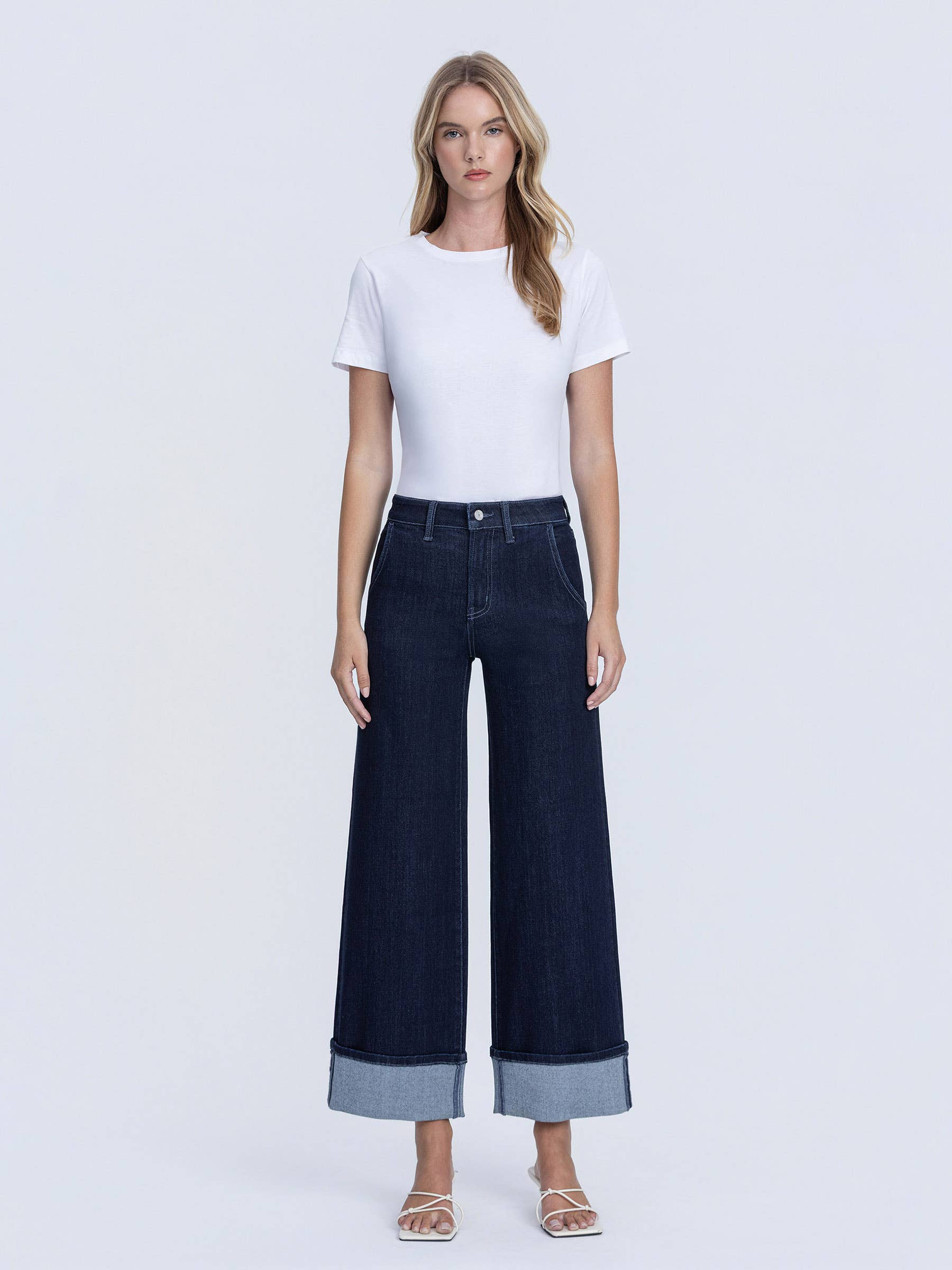 HIGH RISE DARK WASH CUFFED ANKLE WIDE LEG JEANS