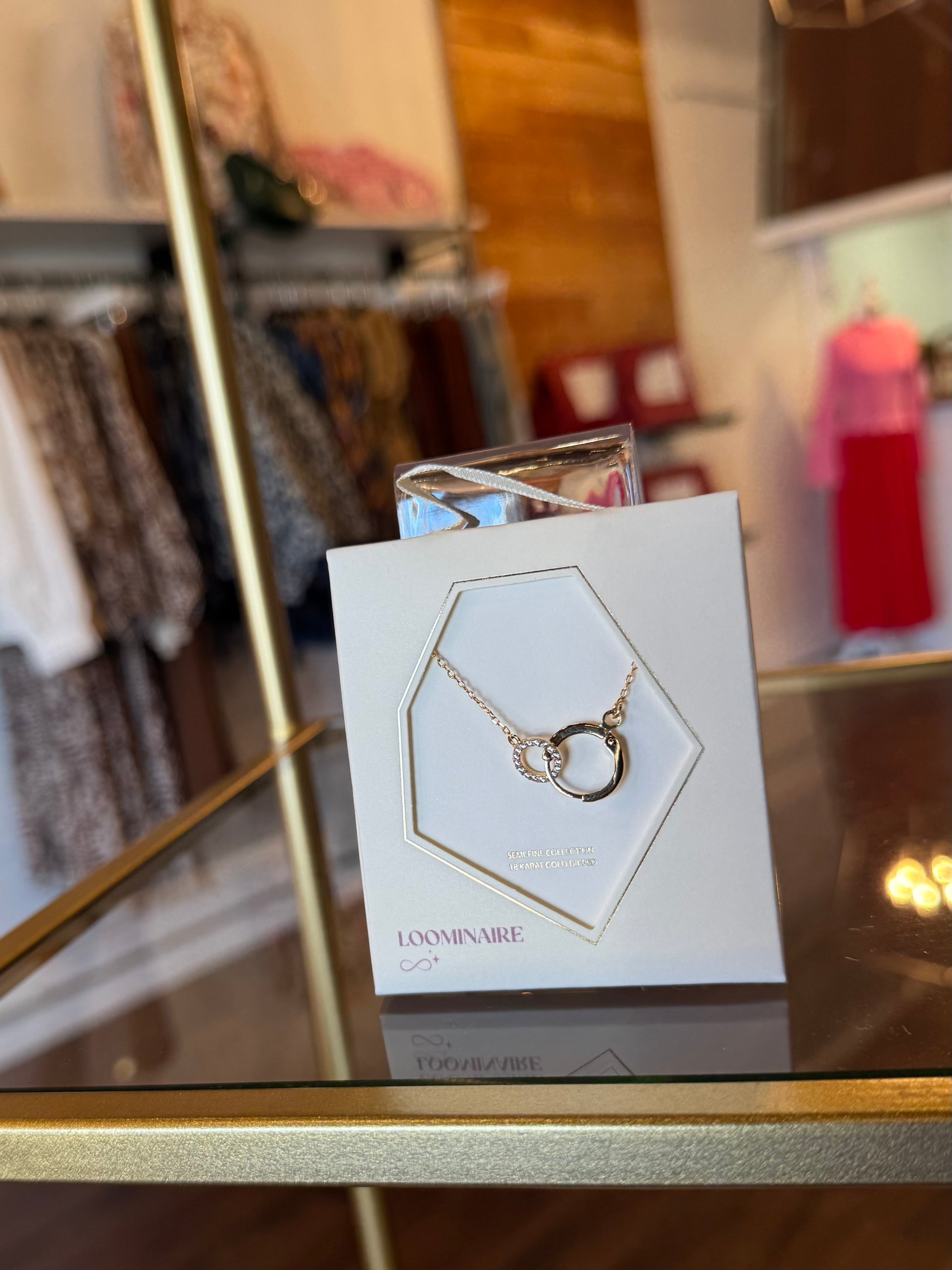 Upgrade your accessory game with our Linked crystal and metal ring pendant necklace. Crafted with precision and elegance, this necklace exudes sophistication and style. The linked design adds a unique touch, while the sparkling crystals and sleek metal bring a touch of glamour. Elevate any outfit with this stunning accessory.