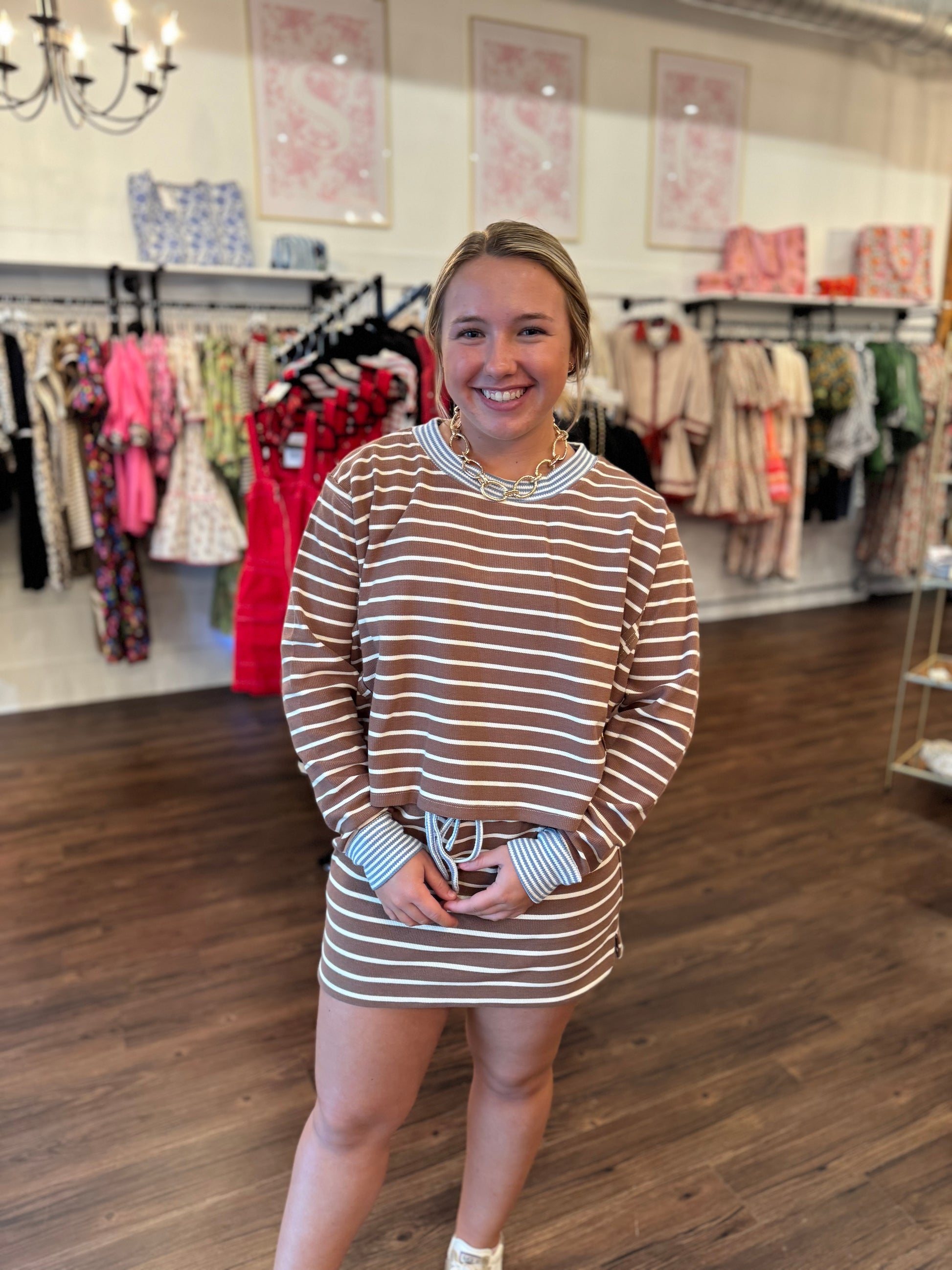 Expertly crafted with a modern design, the Mocha Cropped Pullover is a must-have addition to any wardrobe. The brown and cream stripes create a chic and sophisticated look, while the blue and cream stripe detailing adds a touch of color. Stay warm and stylish with this unique long sleeve pullover.
