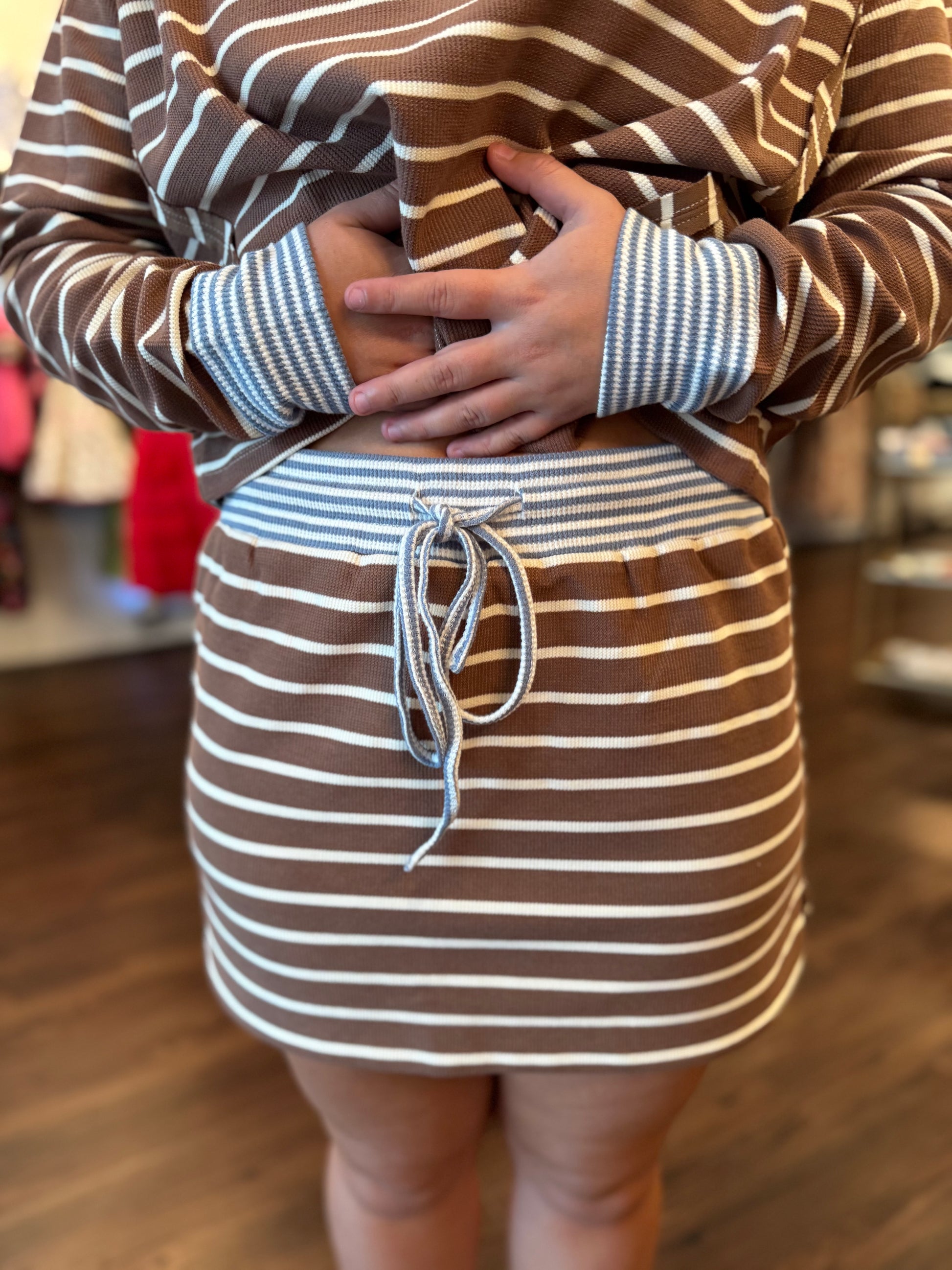 Introducing the Mocha Mini Skort. This stylish skort features a beautiful stripe design in brown and cream, accented with light blue and cream trimming. Stay comfortable and look great in this versatile piece.