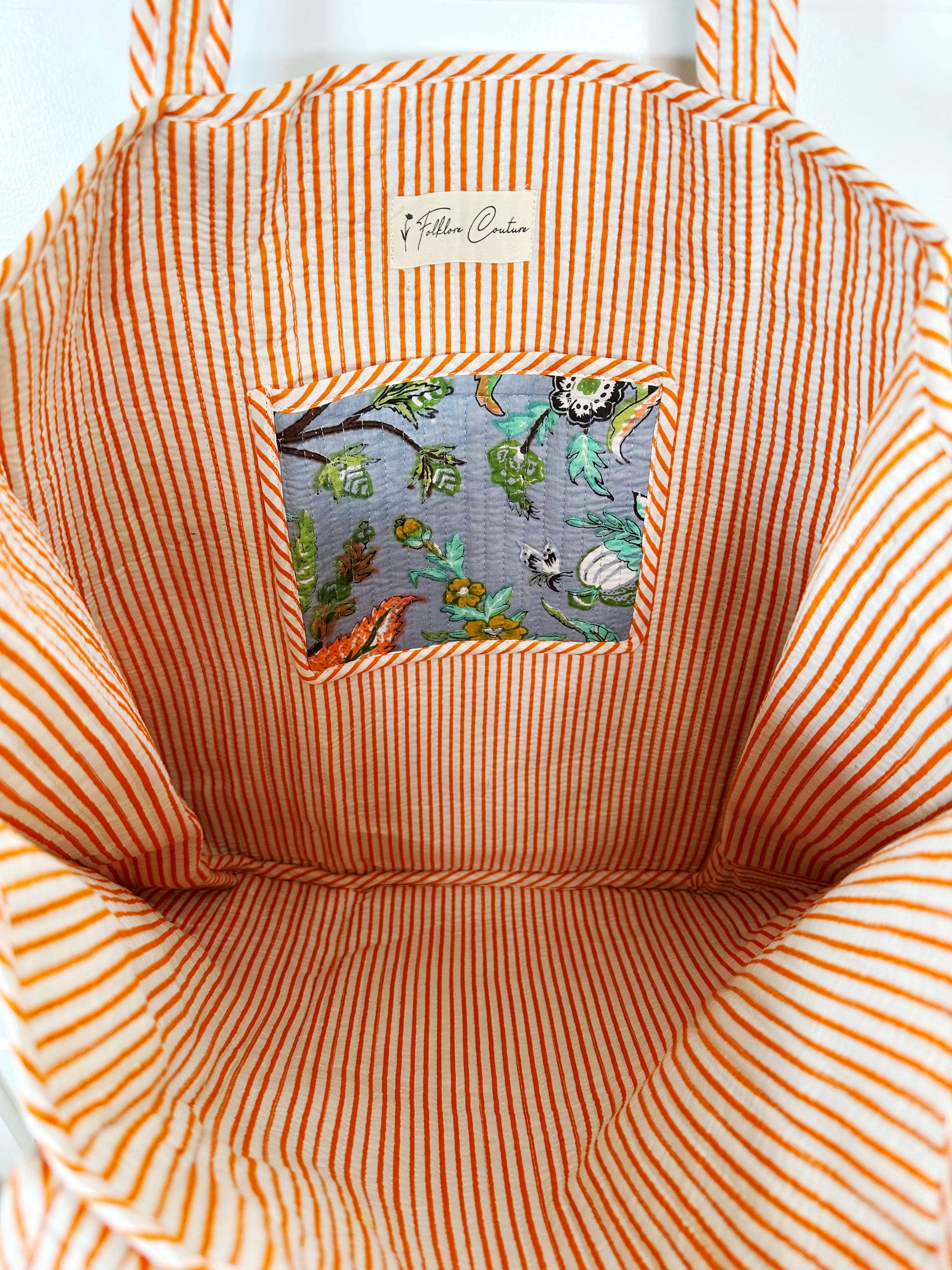 With block printed fabrics, there may be some variations and print placement may vary by bag. Handmade in small batches, prints are very limited.