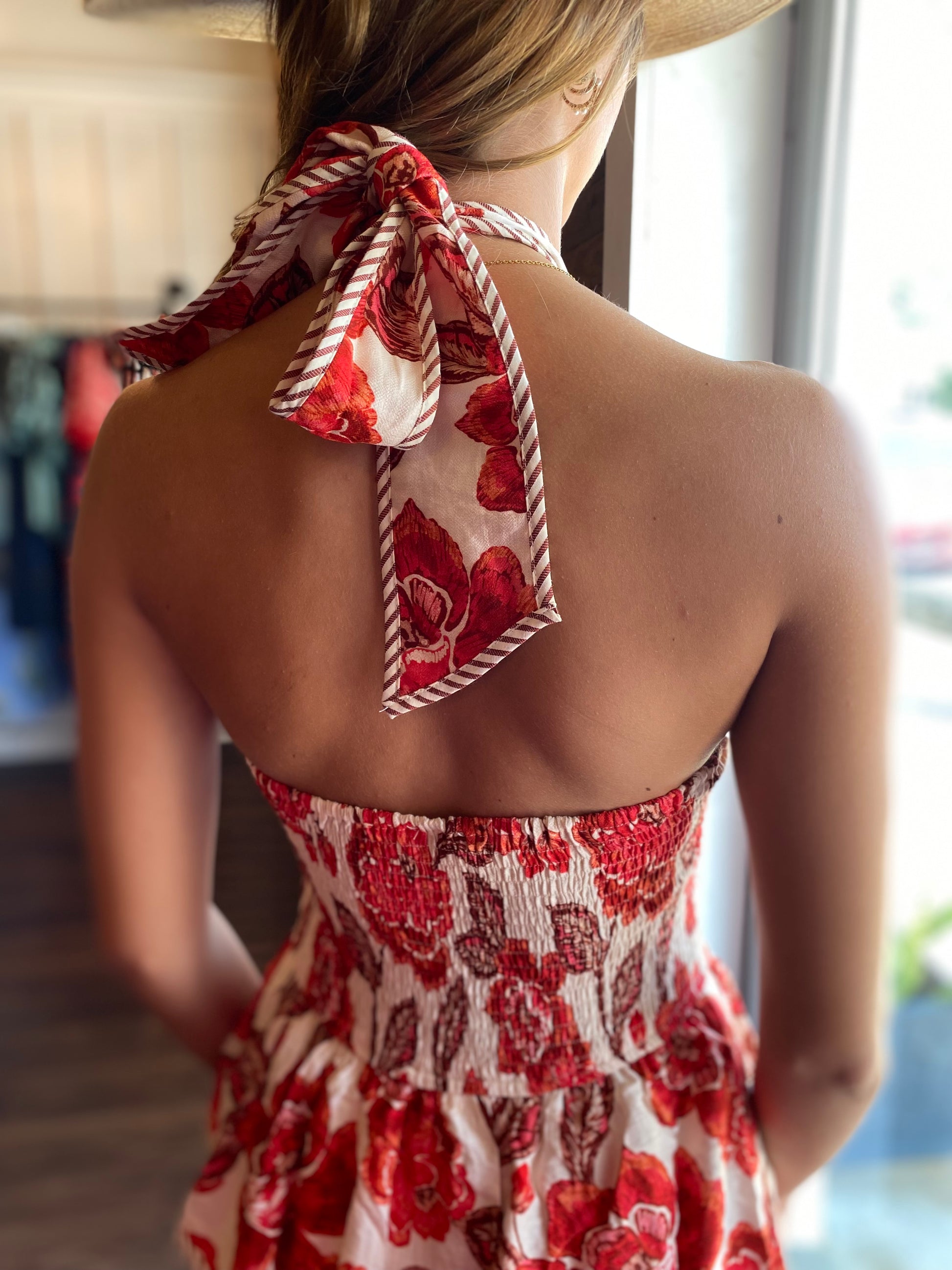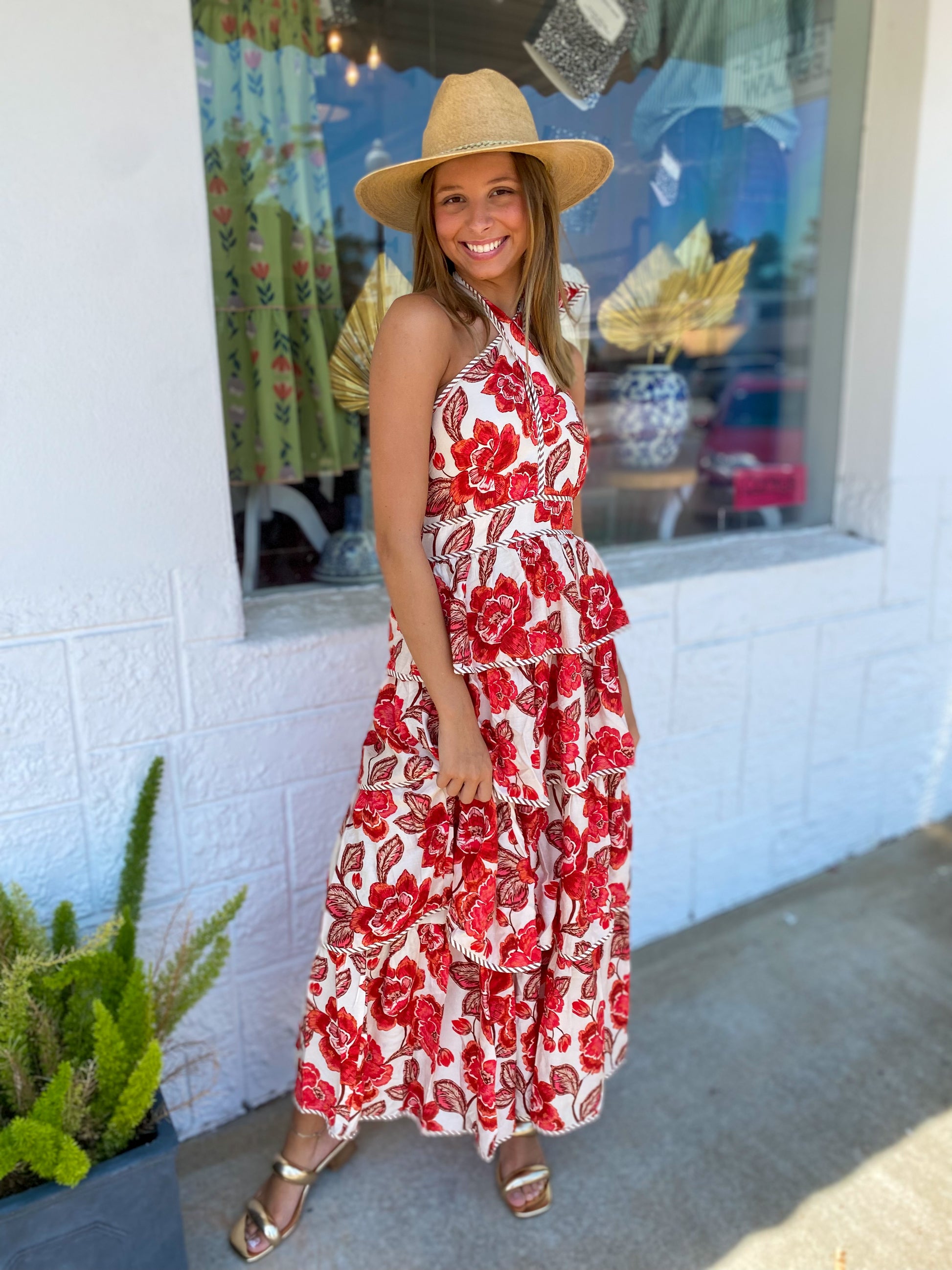 Expertly crafted with a tiered design, this beautiful brick red maxi dress boasts a halter neck and eye-catching floral pattern. With its flowy silhouette, it offers a versatile and elegant option for any occasion. Made with quality material, this dress provides both comfort and style for a timeless addition to your wardrobe.