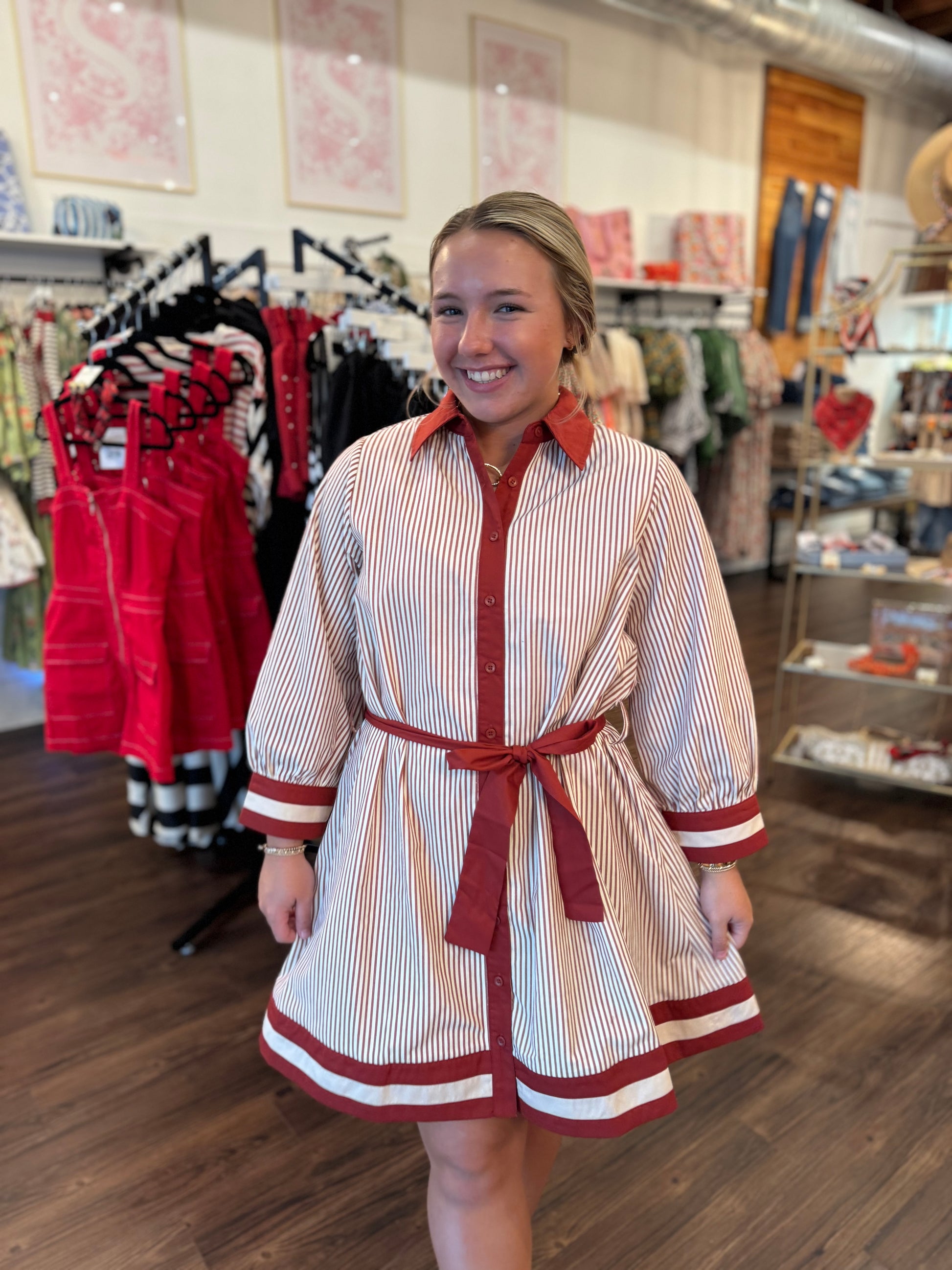 Update your wardrobe with our Stripe Rust Button Down Dress. Made with a rust and stripe pattern, this dress features a flattering tie waist and functional button down design. Enjoy comfort and style with the added bonus of long sleeves. Perfect for any occasion.