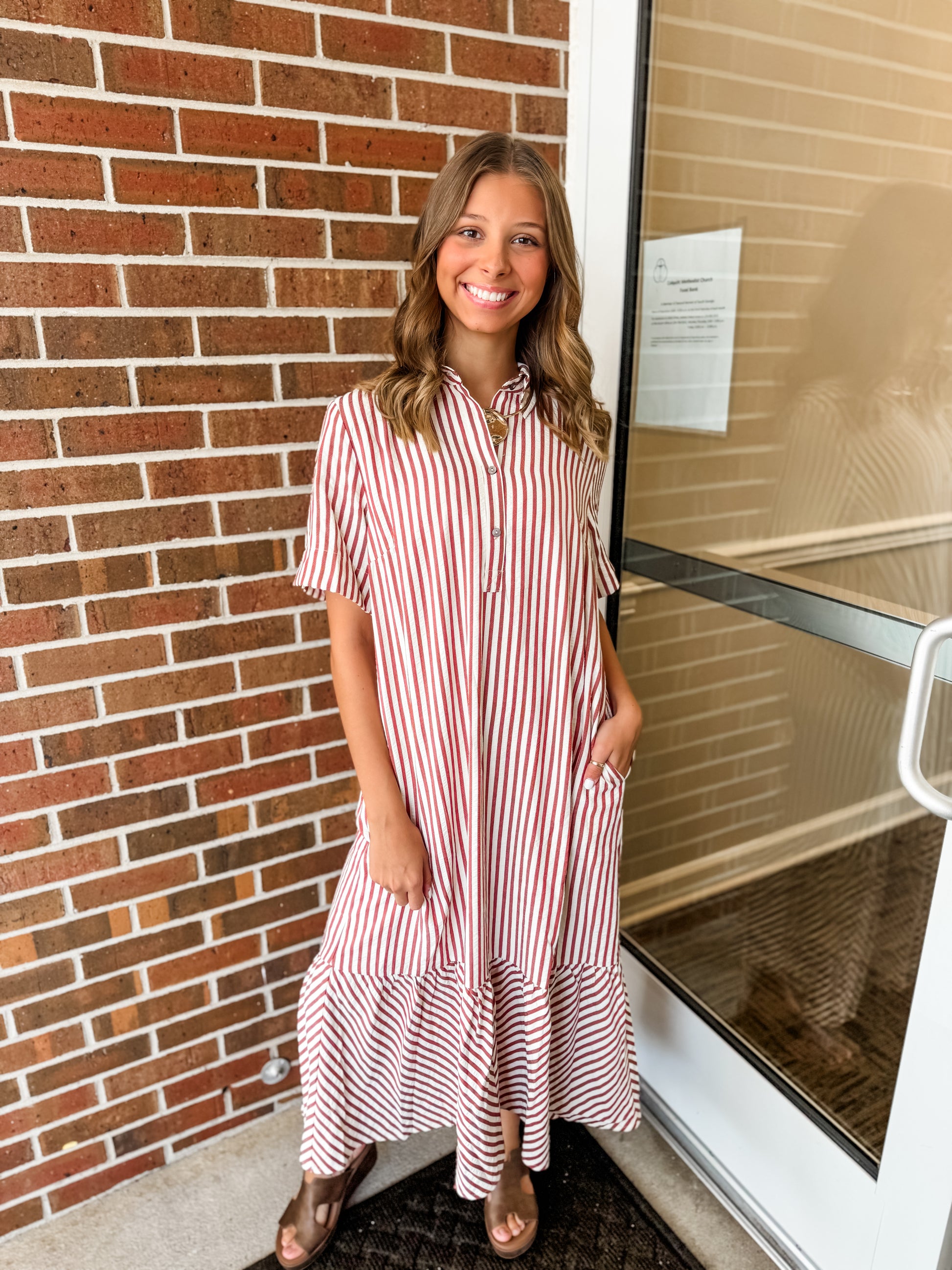 The Serena Stripe Rust Dress is a stylish and versatile addition to your wardrobe. Made from seersucker material, this dress features a quarter button-down collar and short sleeves for a classic look. The vertical and pinstripe pattern adds a touch of sophistication, while the flutter bottom creates a flowy and flattering silhouette. Perfect for any occasion, from work to date night.