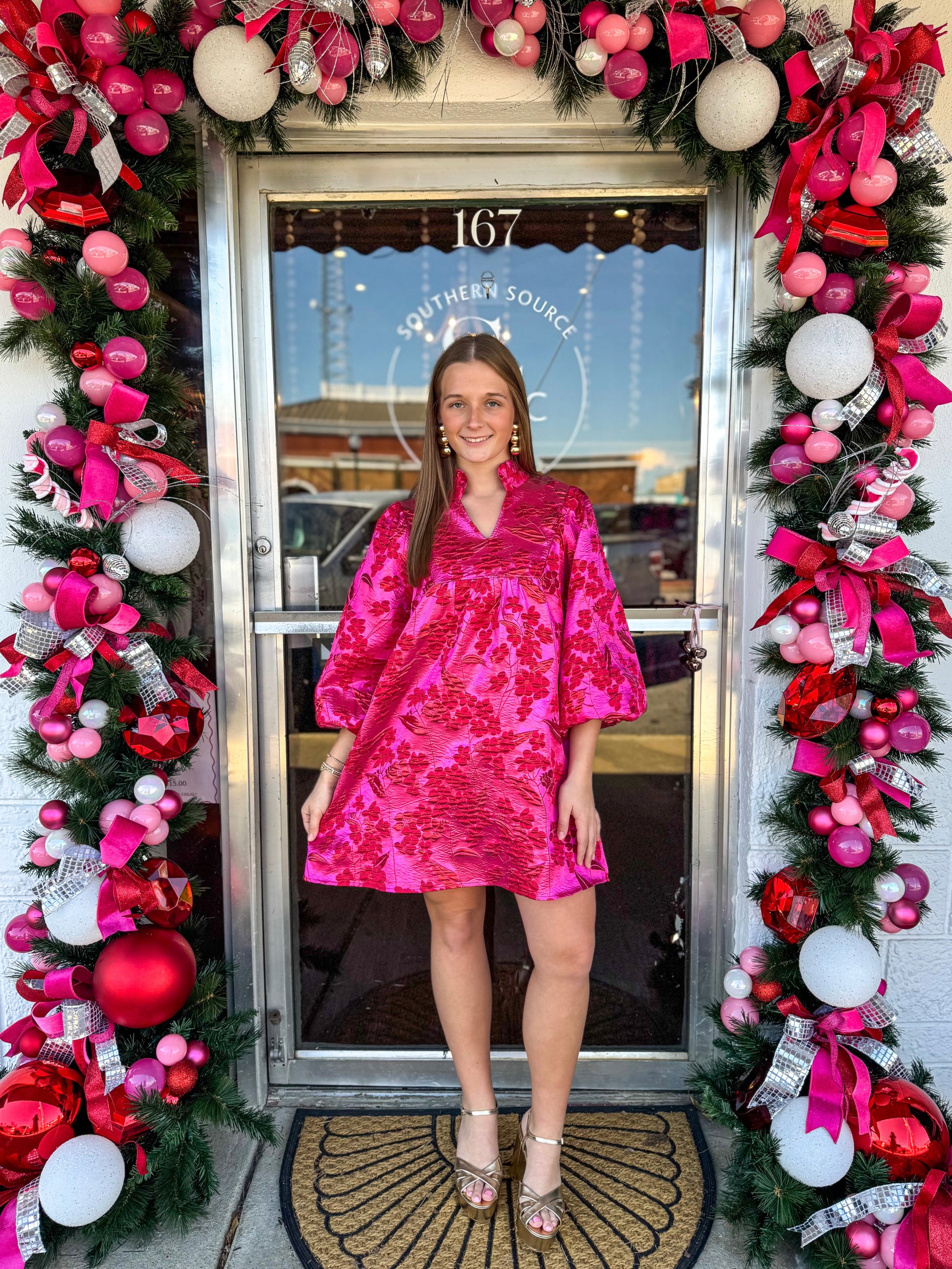 Get ready for a floral frenzy with our Hot Pink Jacquard Dress! This dress features a vibrant metallic pink and red floral design, playful quarter length puffy sleeves, a flattering v-neck and ruffle mock neck, and even convenient pockets. Perfect for any occasion, this dress will make you stand out in the best way possible!