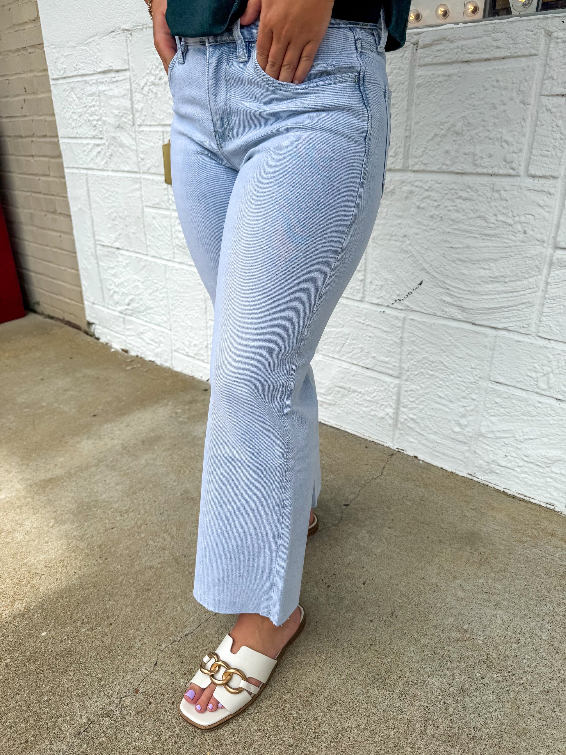 Upgrade your wardrobe with Vervet High Rise Wide Leg jeans in light wash. The ultimate combination of style and comfort, these jeans feature a high rise fit and wide leg design. Elevate your denim game with Vervet and feel confident and fashionable.